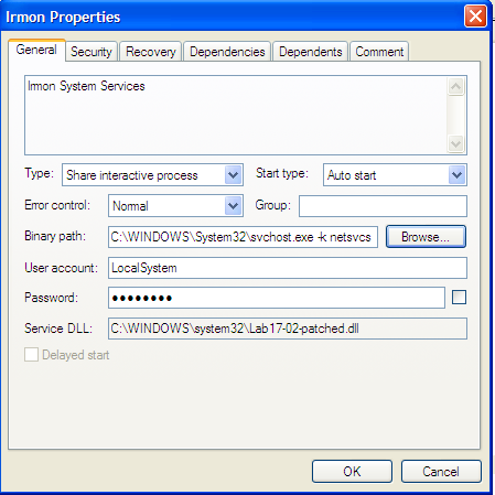 InstallSA installs a service called Irmon System Services that runs the malicious DLL as service by default.