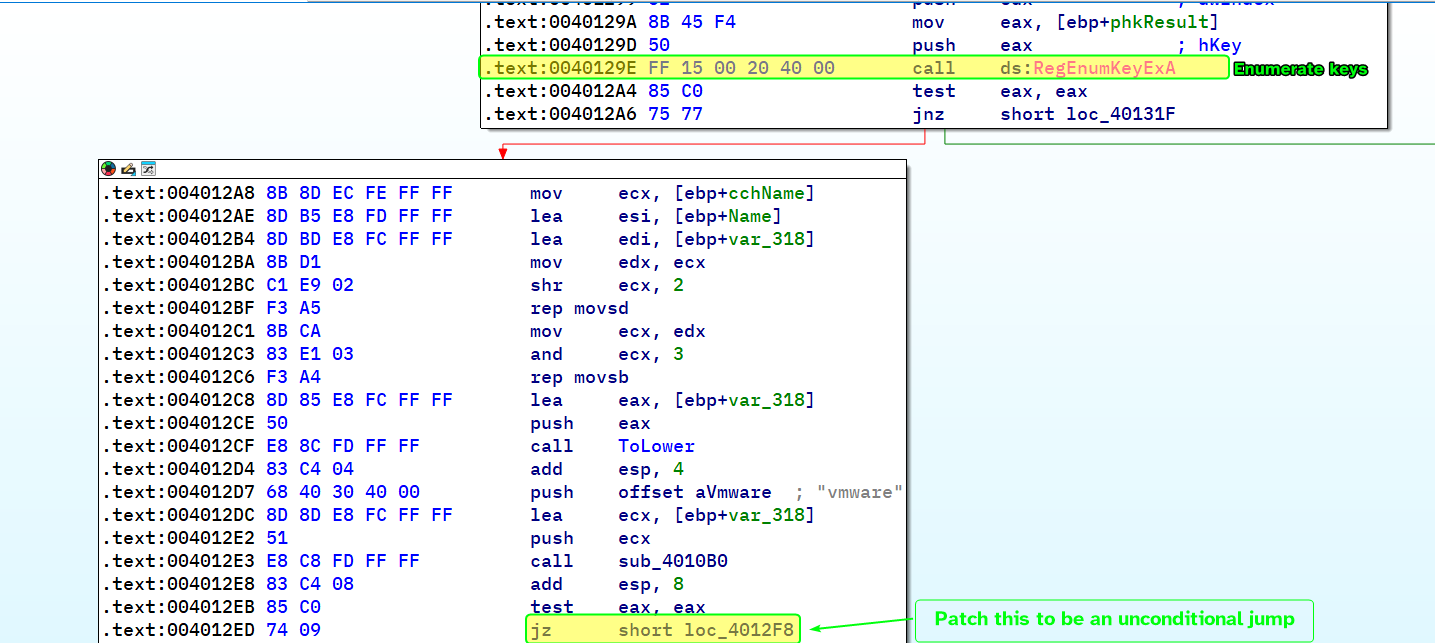 We can then patch the jump condition so that we don’t exit prematurely.At sub_4011C0, it attempts to enumerate keys at HKLM\SYSTEM\CurrentControlSet\Control\DeviceClasses and compare them with the hardcoded string vmware.