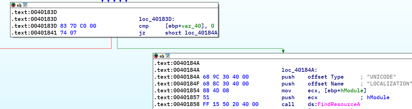 Within ManageResource (sub_401670), before the call to FindResourceA we can see a comparison that determines if the program gets to load the resource in the first place or not, so we’ll have to turn it into a conditional jump.