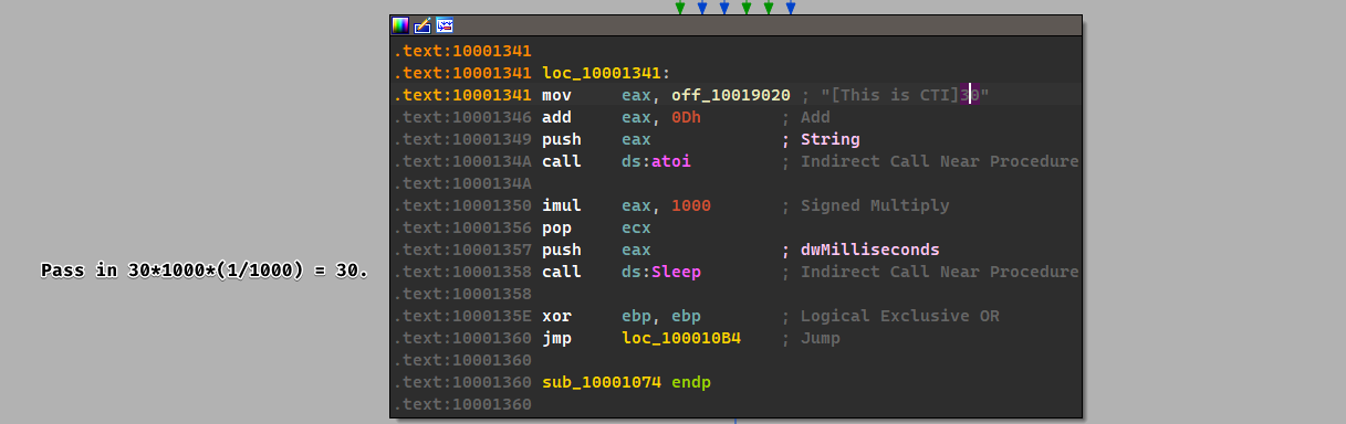 - At 0x10001358, there is a call to Sleep (an API function that takes one parameter containing the number of milliseconds to sleep). Looking backward through the code, how long will the program sleep if this code executes?