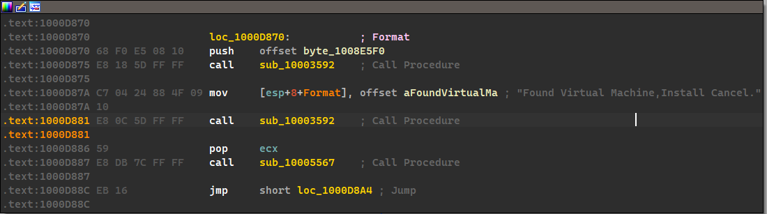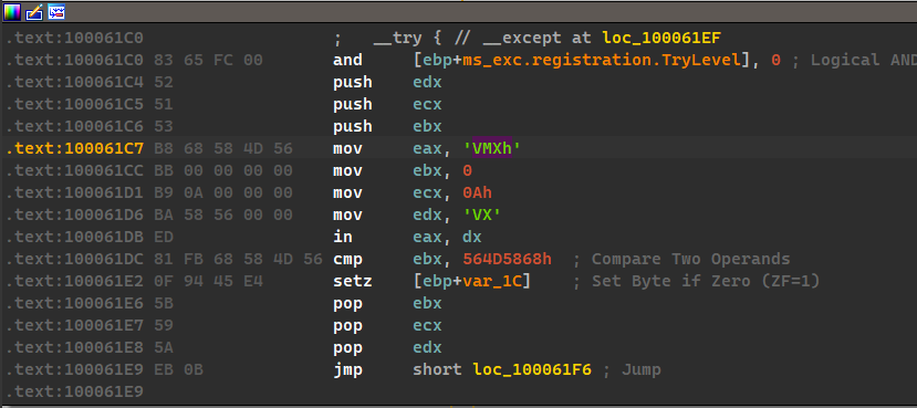 - Search for usage of the in instruction (opcode 0xED). This instruction is used with a magic string VMXh to perform VMware detection. Is that in use in this malware? Using the cross-references to the function that executes the in instruction, is there further evidence of VMware detection?
