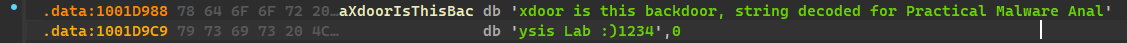 xdoor is this backdoor, string decoded for Practical Malware Analysis Lab :) 1234. - We transform it into a string by clicking A, which transforms it from bytes to ASCII string.