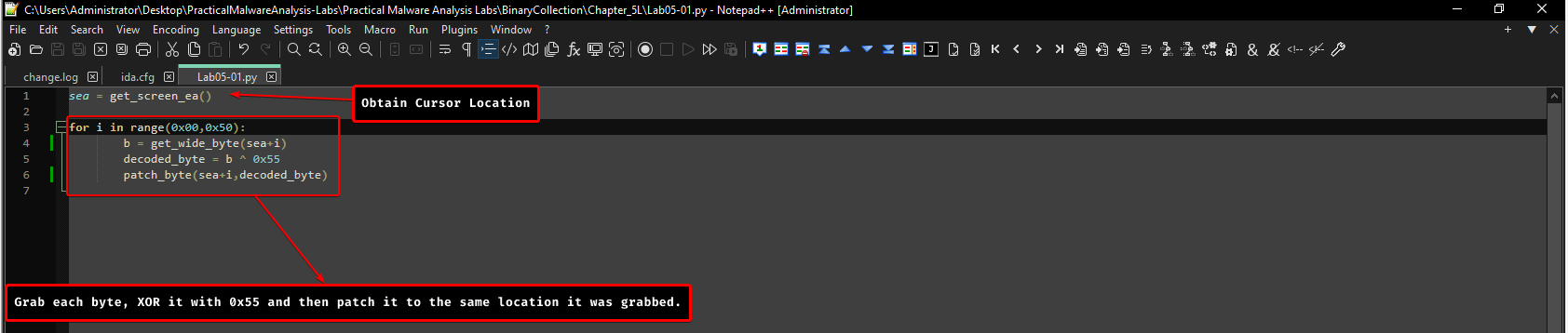 - It works by first grabbing the cursor’s location, then it iterates 0x50 times where: we obtain each byte, XOR it with 0x55 and patch each iteration with the newly XOR’d value.